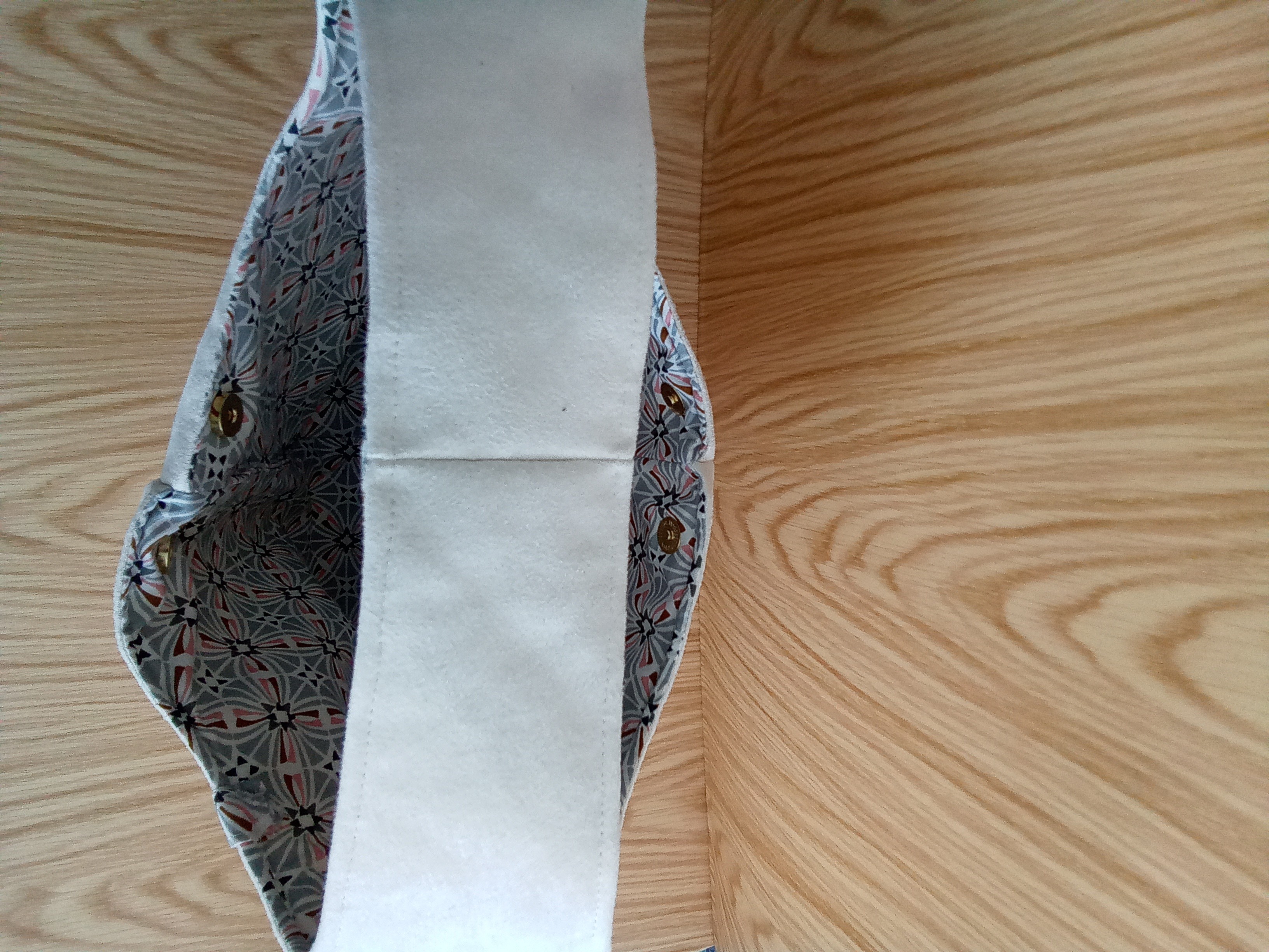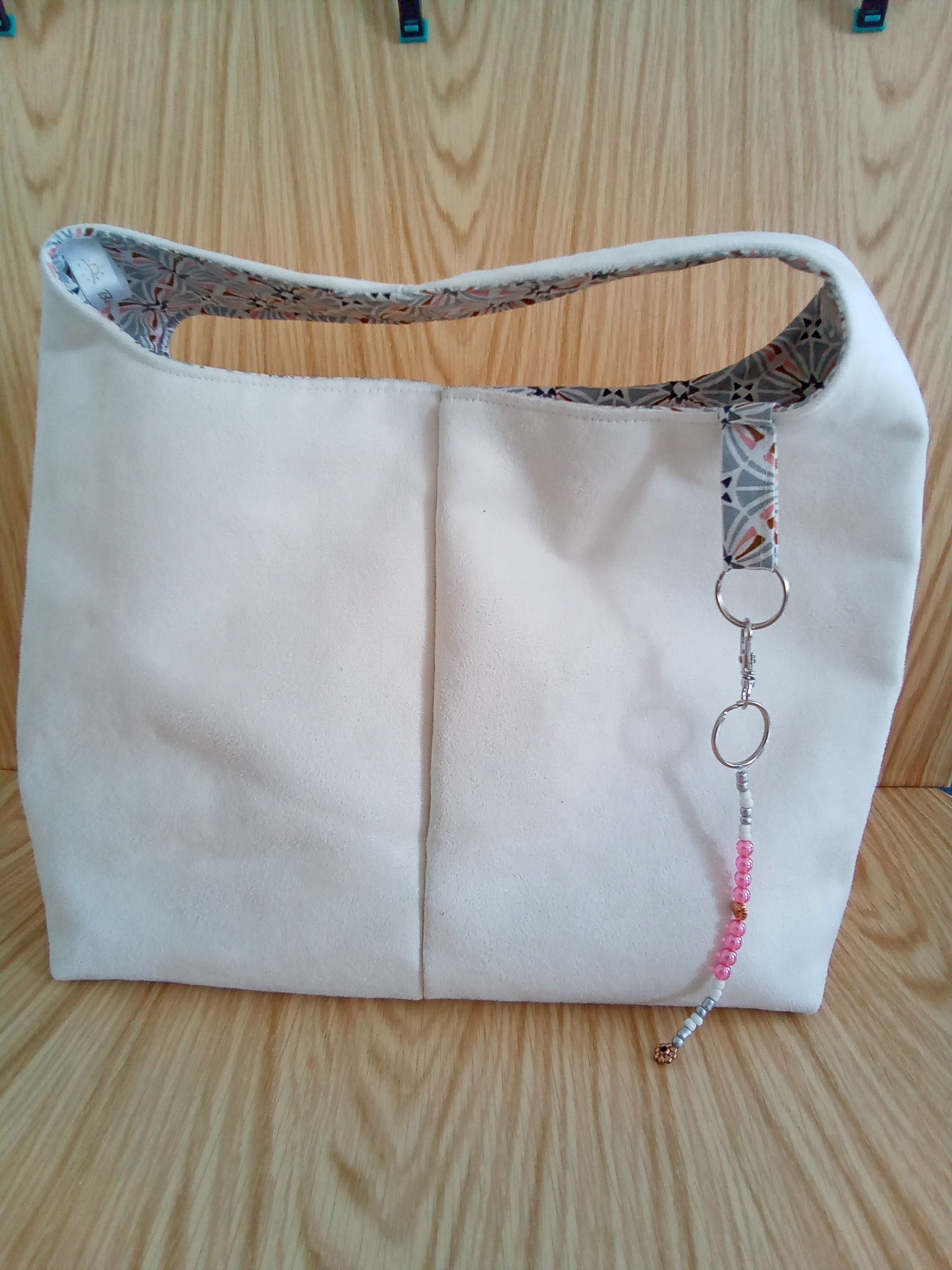 Confectionné en suédine blanche et coton imprimé gris et rose, il allié matières nobles et finitions délicates.